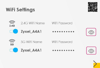 Go to the WiFi Settings widget on the main window. This page shows the WiFi name and passwords. Click the eye icon to show the passwords.