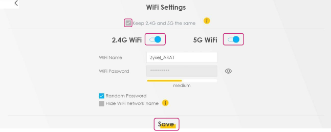 - Click the 2.4G or 5G WiFi toggle buttons to enable or disable them.